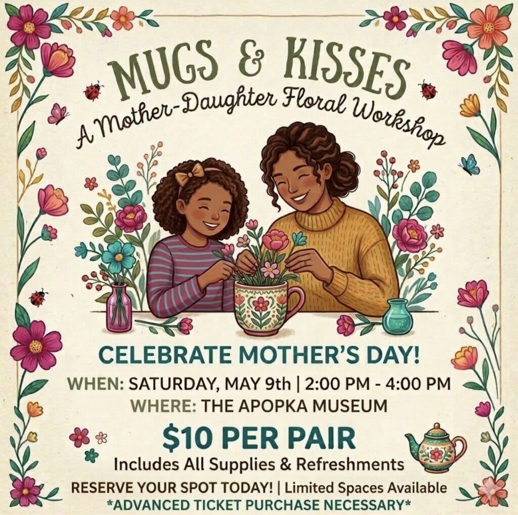 Celebrate the special bond between mothers and daughters this Mother’s Day weekend at the Apopka Museum. Join us on Saturday, May 9th, from 2:00 PM to 4:00 PM for a hands-on experience designed to help you make lasting memories while crafting charming miniature floral centerpieces in keepsake mugs.